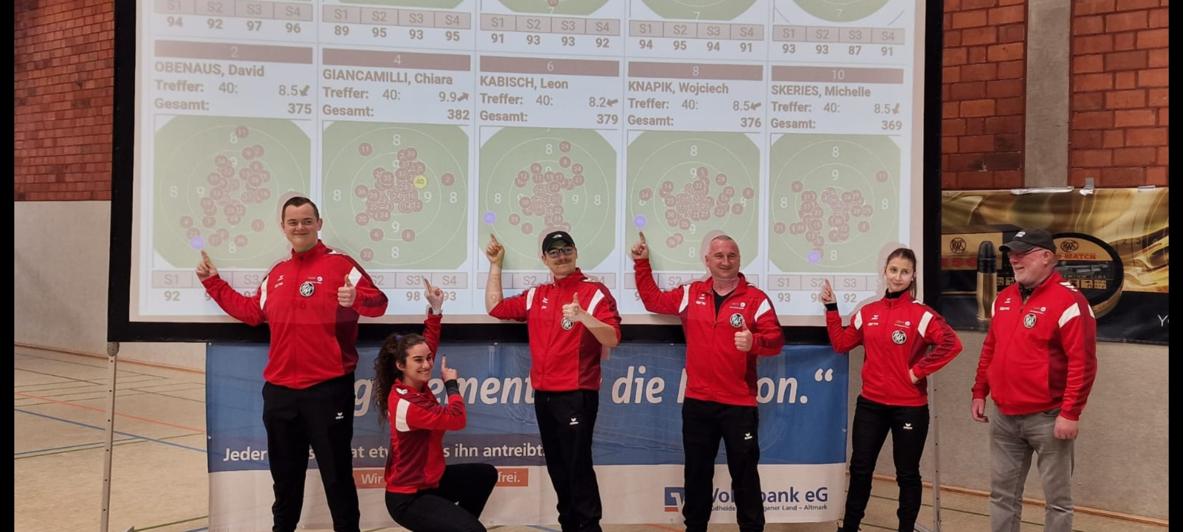 Unser Bundesligateam Luftpistole hat mit 2 beeindruckenden Siegen am letzten Wochenende den Finaleinzug perfekt gemacht! Gegen Fahrdorf wurde am Samstag souverän 5:0 gewonnen. Damit hatte der unmittelbare Kontrahent auf den letzten der 4 Finalplatzränge Wathlingen keine Chance mehr, unser Team von diesem Platz zu verdrängen. Am Sonntag dann der 11. und damit letzte Vorrunden-Wettkampf der Gruppe Nord 1. Bundesliga. Gegner war eben jenes Team aus Wathlingen. Spannend war es bis zum Schluss. Die Führung wechselte mehrfach. Doch am Ende hatten unsere 5 Sportler mit 4:1 die Oberhand behalten, auch wenn man noch ein bissel besser beim letzten Schuss werden muss (siehe Foto).
